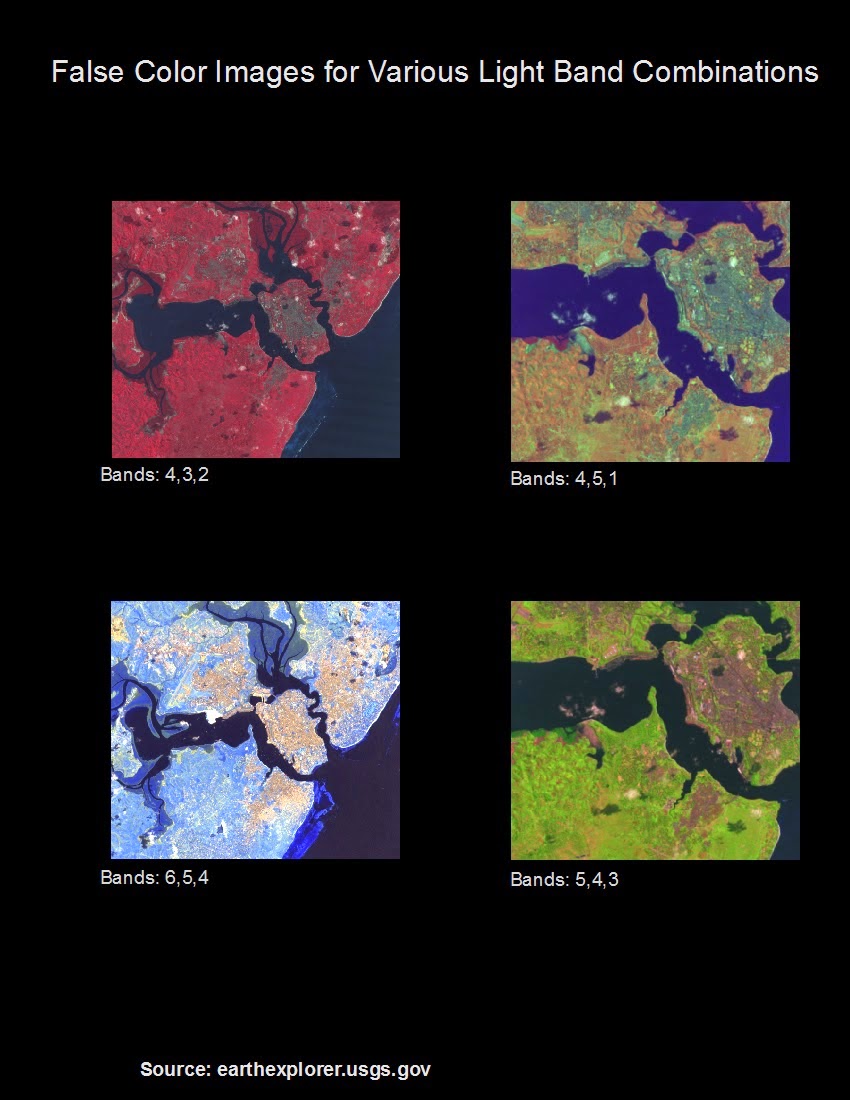 Below are several false color images of a few combinations that can be created using different bands. Notice how in the first, urban land is green and different geological features are shades of red. The image in the bottom left of the graphic shows different ocean depths and the reef clearly. Each combination of light bands highlights different types of features.