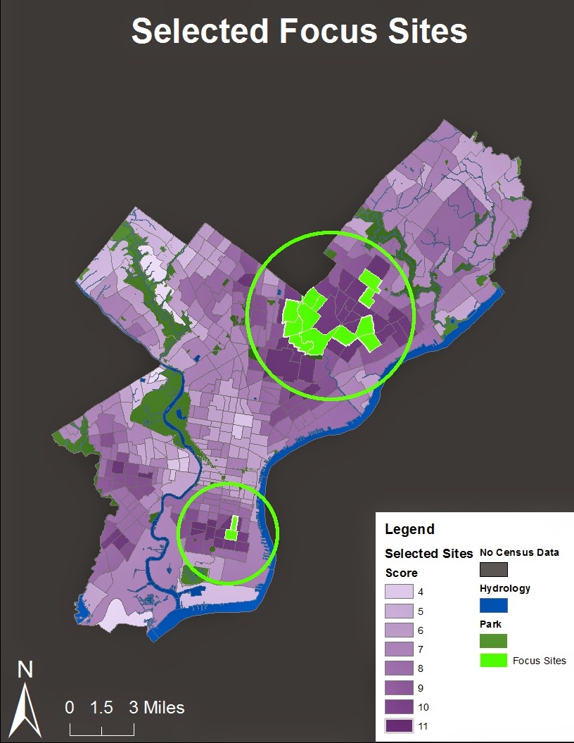 To pick the best particular sites within high scoring areas, the score for each census tract was combined with the scores of its neighbors. Then the total score in a tract was divided by the total number of neighboring tracts to create an average. As a result, a large tract such as the one in the center of Philadelphia that contains the large green swath of Fairmount Park, and neighbors about 20 different census tracts is left with average score comparable to a small tract with only 5 neighbors. The end result of this process will identify the census tracts with a high score that are also surrounded by the best group of other tracts that scored highly as well.